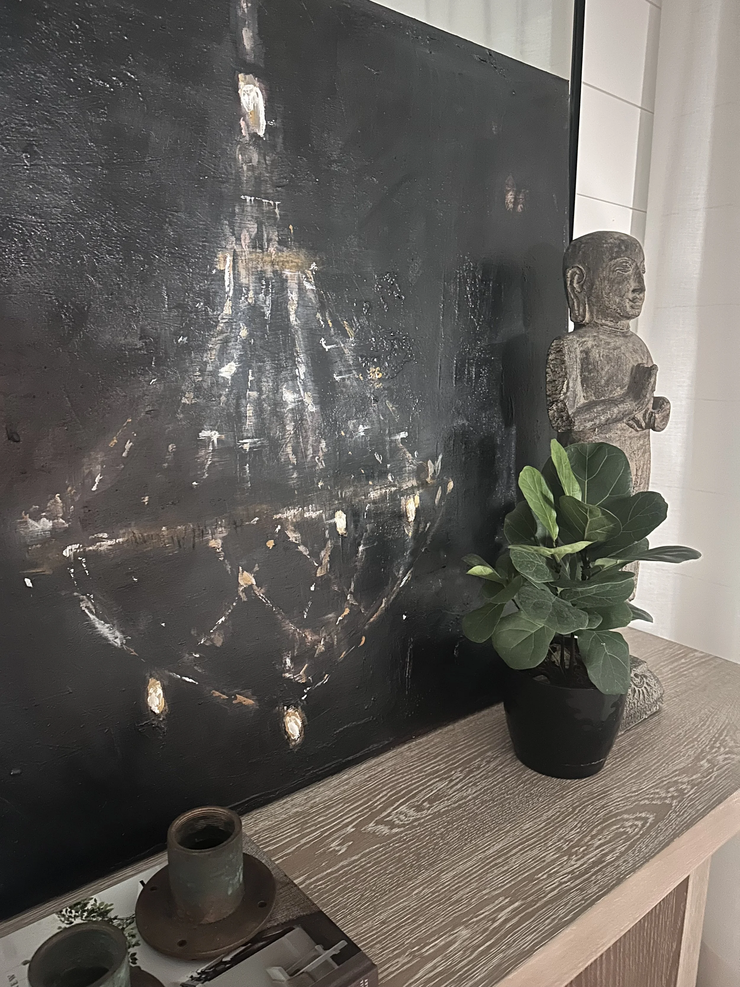 Her works are inspired by the natural environment, especially wood, water, foliage and rock formations. The repeat of pattern is prevalent as each repeat stroke is singular but powerful in multiple numbers. Her works have a human and organic quality with a primitive edge. Crumbling and decaying finishes on man made structures along with natural occurrences in nature have inspired her works. She counts the works of multi-disciplinary artists Cy Twombly, Louise Nevelson and Gio Ponti inspirational to her art trajectory with the study of canvas, sculpture and design.