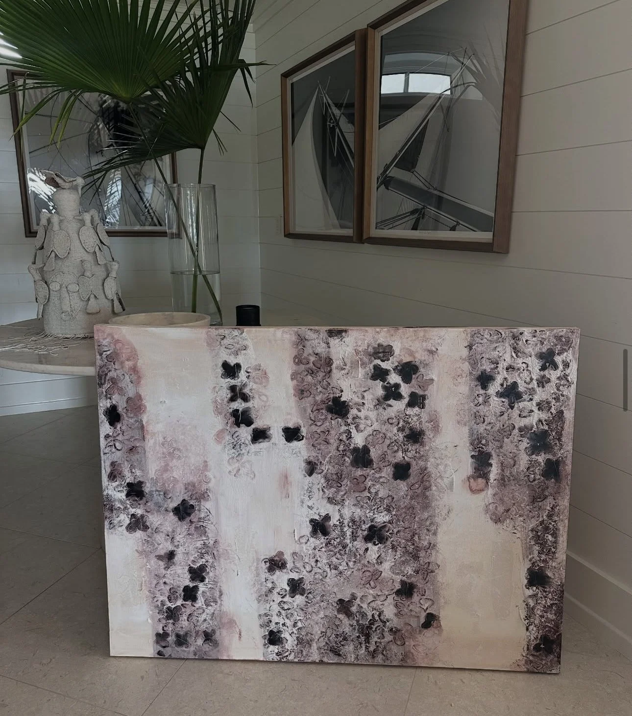As a product and interior designer, I am surrounded by visual arts daily. My original contemporary art is a natural extension of my creative process. I am attracted to the repeat of pattern or shape, which is prevalent in my pieces. Each repeat stroke is truly singular but powerful in multiple numbers. The pieces have a human and organic mood with a primitive edge. The removal of paint is important in many of the compositions and I am intrigued that removing material is sometimes stronger than adding more to the canvas.
